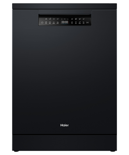 This dishwasher features modern styling in a black finish to match Haier refrigerators. The control panel is angled for easy reading, with touch-capacitive controls and a child lock.